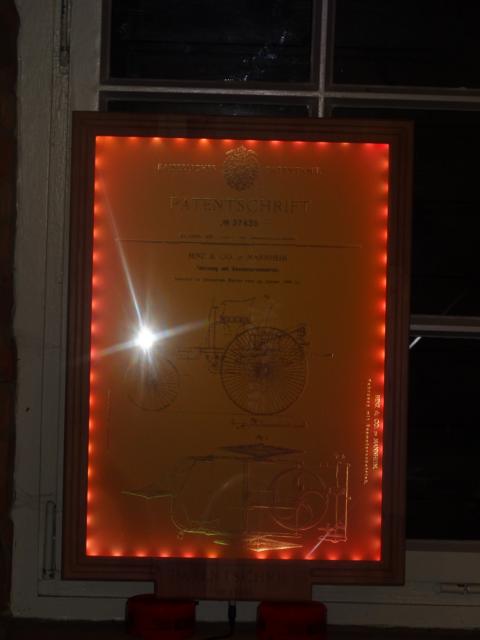 Im Anschluss ging es dann in die Benzgarage und bei einer heißen Gulaschsuppe und kalten Getränken wurde die Feier fortgesetzt. Bei dieser Gelegenheit übergab unser Clubmitglied eine gravierte Plexiglasscheibe mit dem Motiv der Patenturkunde für das Benz Dreirad.